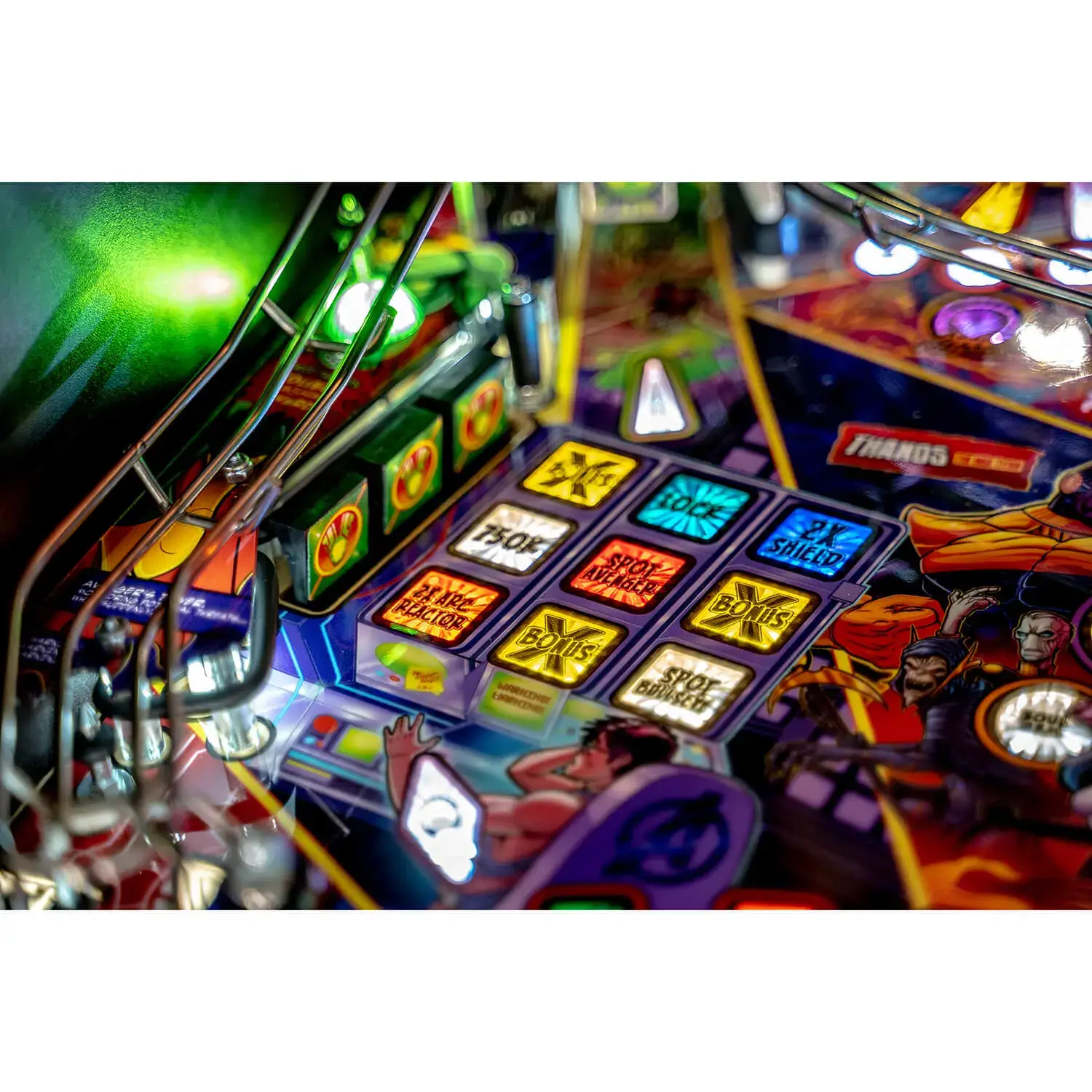 The Pro, Premium, and Limited Edition models all feature an interactive Dr. Strange spinning kinetic sling ring disc with dual direction velocity detection, aiding players on their journey to opening portals and starting Infinity Gem quests. All models feature a gravity defying Avengers Tower magnetic lock ramp with gravitational vari-target and magnet hold, capturing pinballs in midair as players unlock Iron Man Multiball. In addition to distinct hand-drawn artwork, all models feature an Avengers Computer Bingo grid 3-target drop bank, a Thor captive ball, Hulk spinning target, custom intricate wireform ramps, and 3 full size flippers.