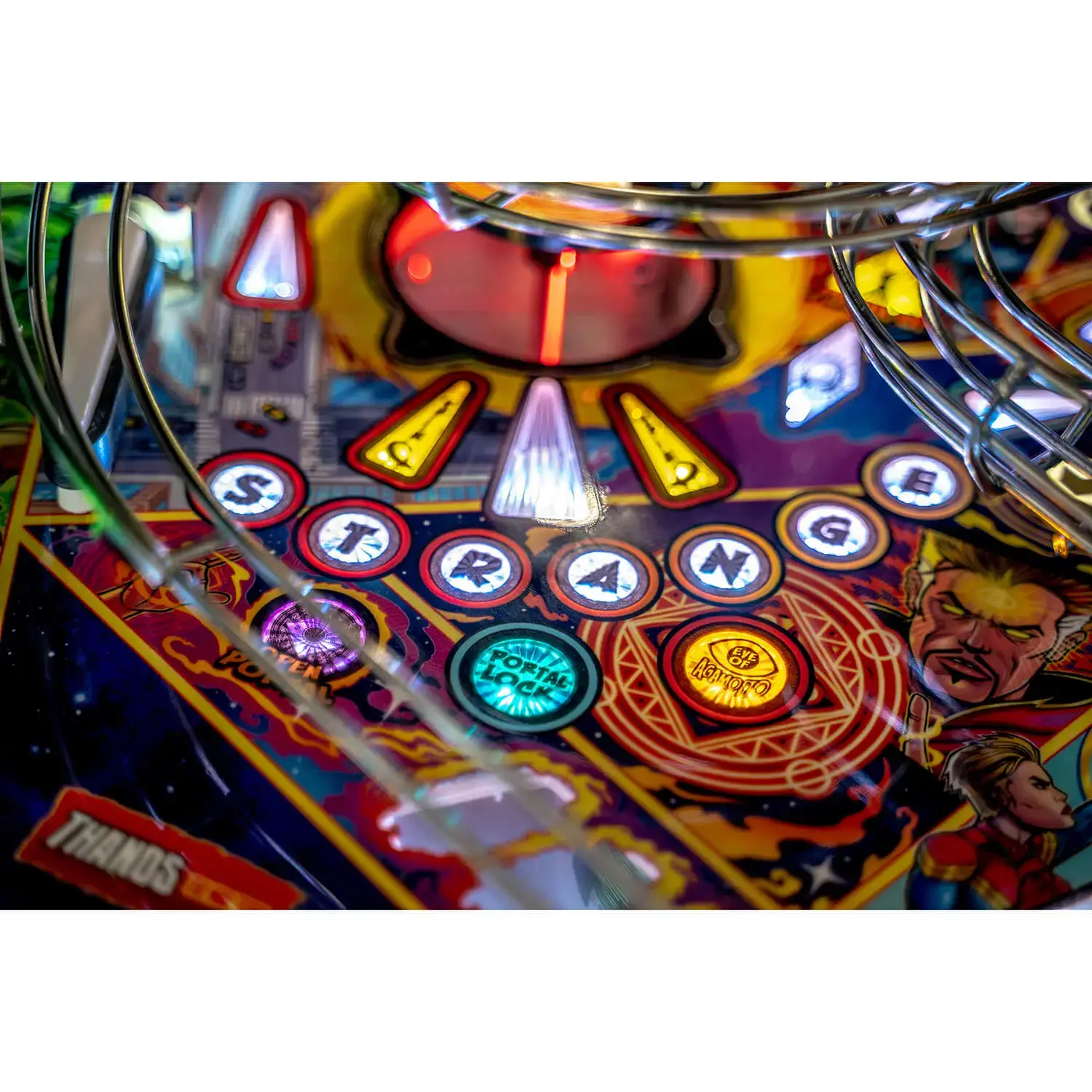 The Premium model features an interactive Dr. Strange motorized pop-up disc scoop, transporting pinballs into an underground Portal, a visible subway capable of holding and staging up to 3 balls through custom playfield windows accentuated with dynamic RGB lighting effects. This model also includes a custom sculpted Thanos Infinity Gauntlet integrated with atmospheric light-up gems, a Captain Marvel inverse gravity custom wireform ramp, and a Pym Laboratories vertical up-kicker.