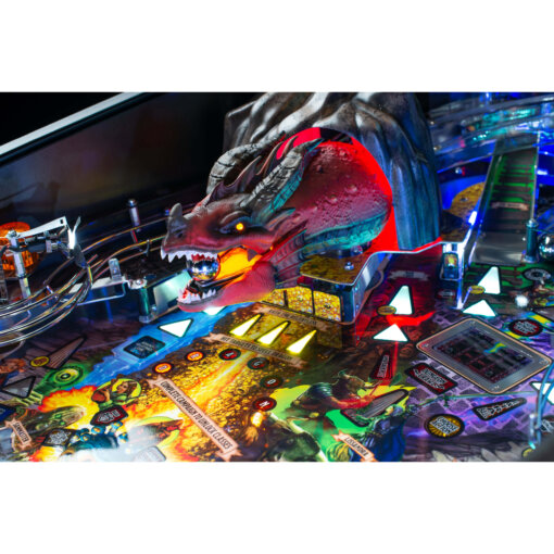 Battle Rath the Relentless, the red dragon, the most advanced animatronic mech in pinball, intelligently reacts to player action with multi-axis motion and features omnidirectional impact sensing technology. Voiced by the iconic Michael Dorn, players will attempt to defeat Rath the Relentless with pinballs and by hitting the 3-bank target, steal its treasure. When Rath the Relentless breathes his magnificent fire, multiple pinballs shoot from its mouth but be prepared. Players can activate a metal shield between the flippers to not only defend against attacks but also assist with playfield shots.