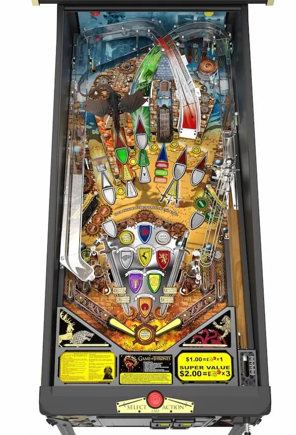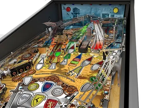 The Game of Thrones pinball machine is available in three models offering a variety of pricing and exclusivity for Game of Thrones fans and pinball collectors. All three models feature an animated, interactive dragon that roars, flies, and breathes fire through the magic of all-LED lit playfields. Players can slam the ball into the Battering Ram, attempting to break down the Castle Doors and grab features such as Super Jackpots, Wild Fire, and Playfield Score Multipliers. The animated mechanical Sword of Multiball holds back reinforcements until its time to attack. A bank of three Drop-Targets lights the Lord of Light Lanes to protect against side drains and awards other progressive features. A Kickback fires the ball in anger when struck.