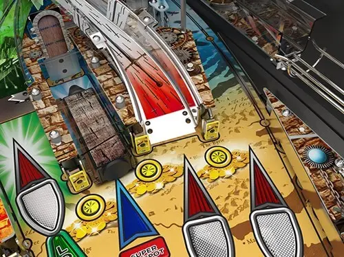 Players can win valuable random awards and features with Reel Pops(TM), a fun new software mechanism, by playing the Pop Bumpers and spinning three virtual spinning reels on the display. When three identical symbols line up, the player is awarded the prize shown on the reels. Earn Gold and spend it on needed weapons and features. An Action Button is featured on the front molding for the largest array of interactive play features ever seen in a pinball machine.