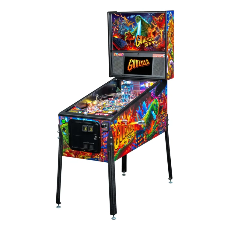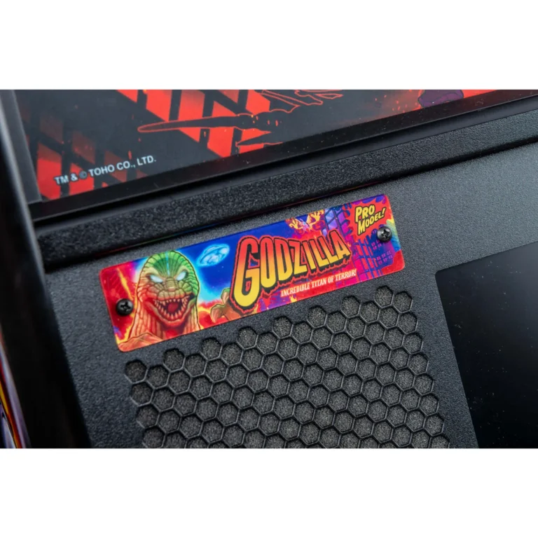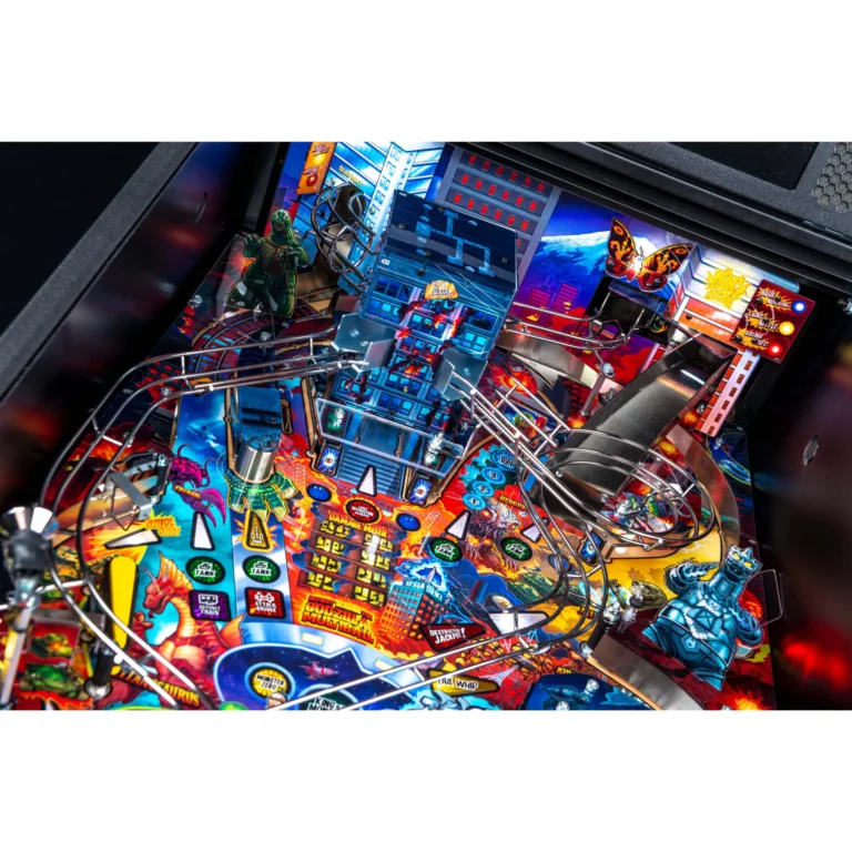 The chaos unfolds on the playfield with Godzilla multiball, triggered by hitting shots through a central skyscraper. All Godzilla pinball machines feature the innovative “Magna Grab” magnetic newton ball, which catches pinballs from five different paths and sets up shots from the upper left flipper. The game also includes Blue Oyster Cult’s iconic song “Godzilla,” hand-drawn artwork by Zombie Yeti, wireform ramps, three spinning targets, three flippers, powerline-themed stand-up targets, and a UFO pop bumper. It showcases video and audio from ten Toho Showa Era Godzilla films for a truly immersive experience.