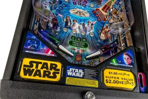 The Star Wars themed Comic Art Pro and Star Wars Comic Art Premium machines made by Stern are packed with features that provide an irresistible game experience. The game includes select dialogue and footage from the original Star Wars trilogy, color-changing LED-lighted inserts, and a sculpted TIE fighter. All models feature two LCD screens. The Premium model also features art representing an exploding Death Star, a sculpted LED-lit Millennium Falcon and an interactive hyperspace loop that encircles the playfield and can accommodate up to 5 pinballs at once.